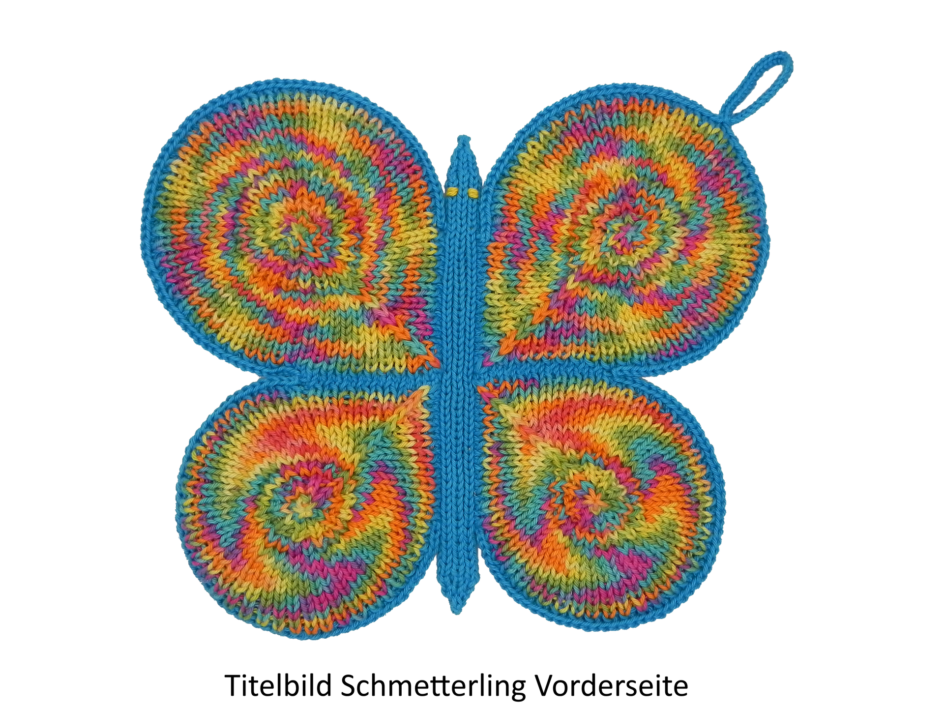 Genauso wie die Schmetterlinge meistens sehr auffällig gefärbt sind, kann man auch unseren Topflappen sehr farbenfroh stricken.