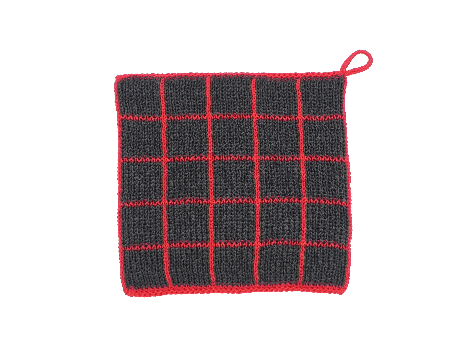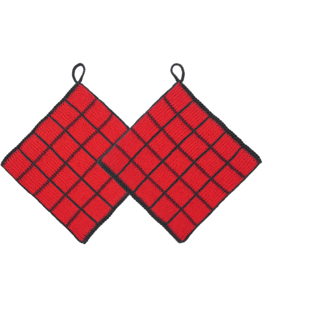 Bei diesem Topflappen sehen Sie die Vorderseite, die Rückseite wird genauso gestrickt. Dieses Modell haben wir in den Farben Rot und Weiß gestrickt, allerdings kann man je nach Wunsch auch zwei andere beliebige Farben nehmen.